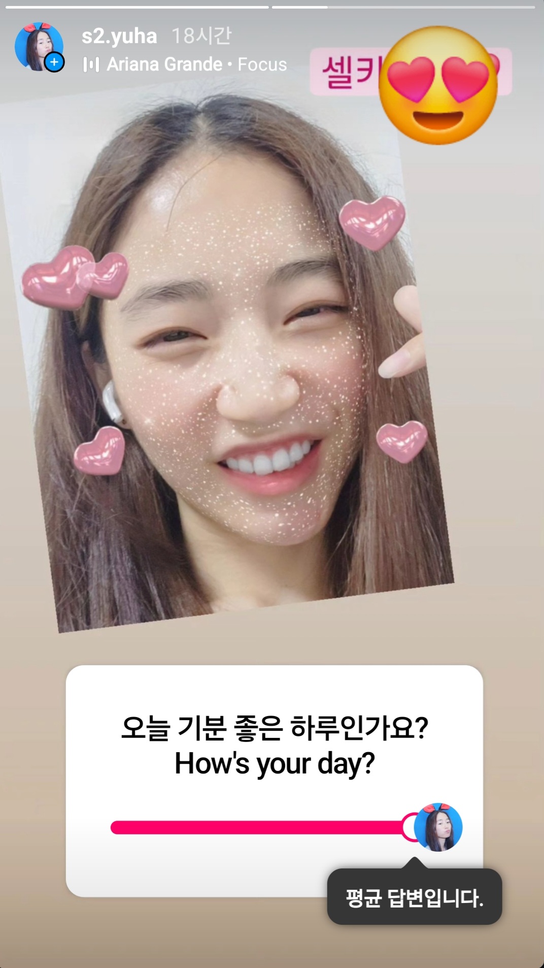 ๋ด ์ธ์คํ ์คํ ๋ฆฌ์ ์คํ ๋ฆฌ๋ฅผ ๋ณด์๋ ๋ถ๋ค๊ป ์ค๋ ๊ธฐ๋ถ ์ข์ ํ๋ฃจ๋๊ณ ๋ฌผ์๋๋ฐ ํ๊ท ๋ต๋ณ์ด ์์ฒญ ๋์์(์์ฒญ ๊ธฐ๋ถ ์ข์๋ค๋ ๋ต๋ณ) ์ ๊ธฐํ๋ค.
